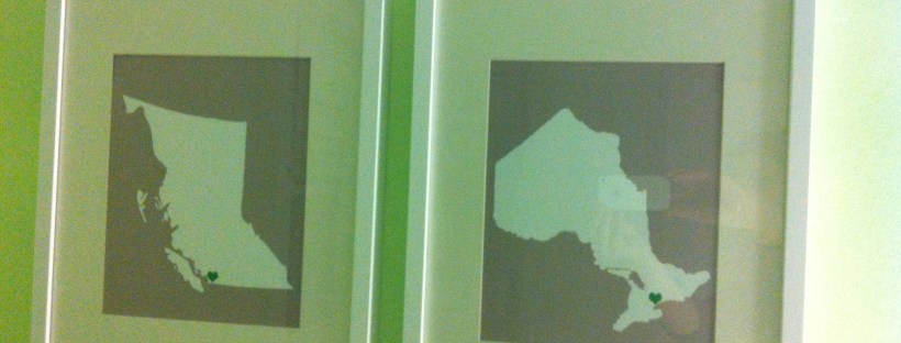 I immediately fell in love with Angie’s “state art” series.  Being from Canada, we of course improvised by making “Province art” prints.  I requested Ontario and BC, to commemorate where Christian and I were born and raised, and added green hearts on Toronto and Vancouver.  Angie was super helpful and speedy, and one week later my beloved prints were hanging proudly above our guest bed!
